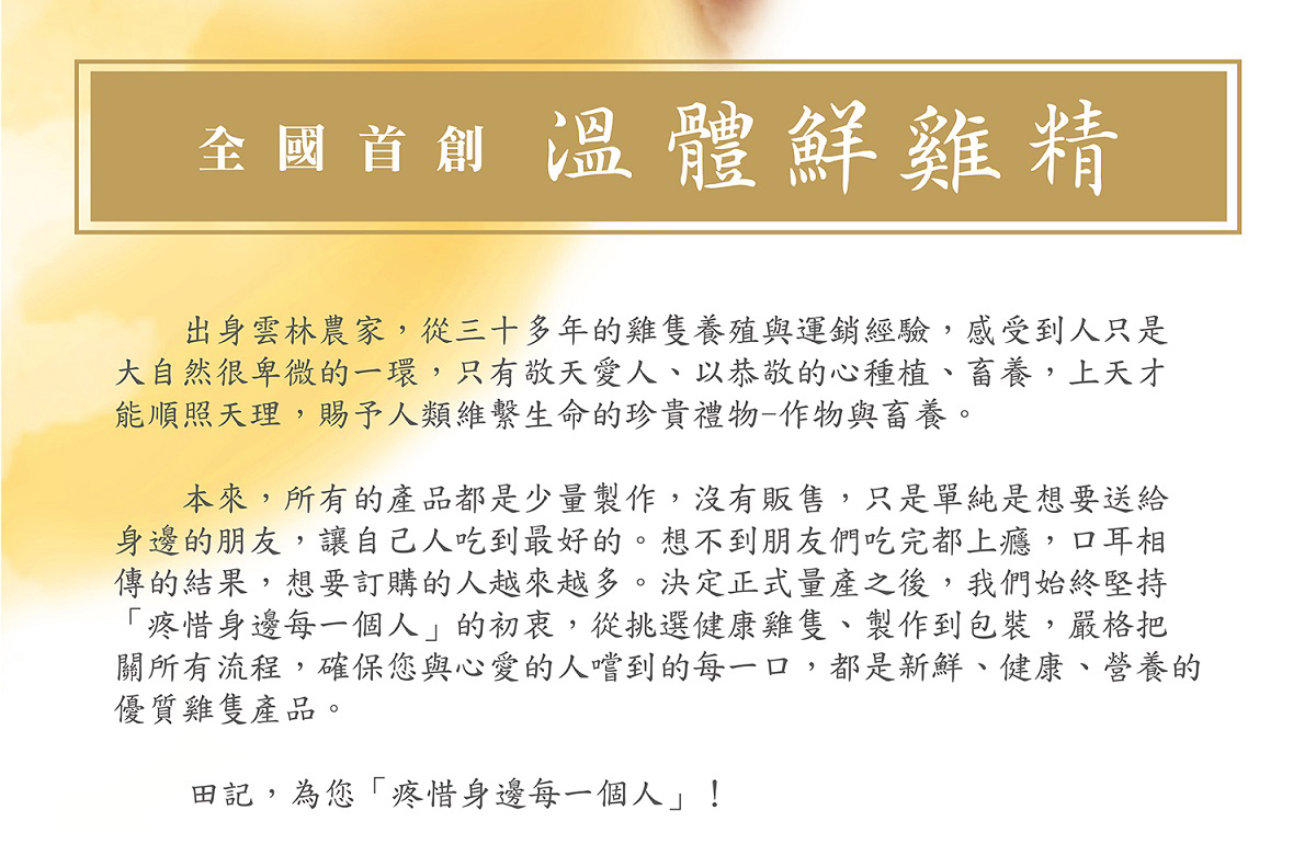 全國首創以未經冷凍的溫體雞製作滴雞精。以足齡十二個月健康雞隻,經合格電宰廠處理的溫體雞,30分鐘內進入製程,十小時內完成製作包裝,進入冷凍保存!過程完全不添加一滴水。新鮮,所以田記滴雞精營養更美味!